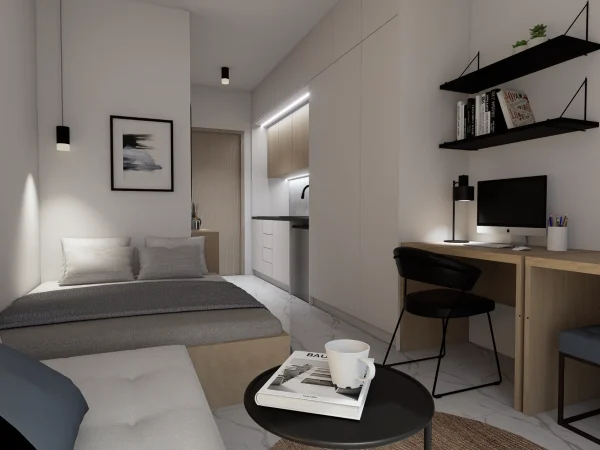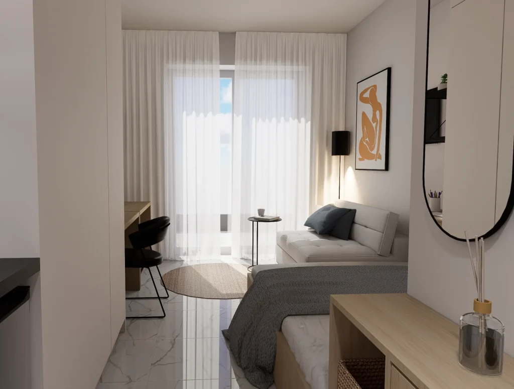 • ריהוט מלא (Turn-key): הדירות מגיעות מאובזרות לחלוטין – ממיטה זוגית, ספה וטלוויזיה חכמה ועד רמת המיקרוגל והווילון.